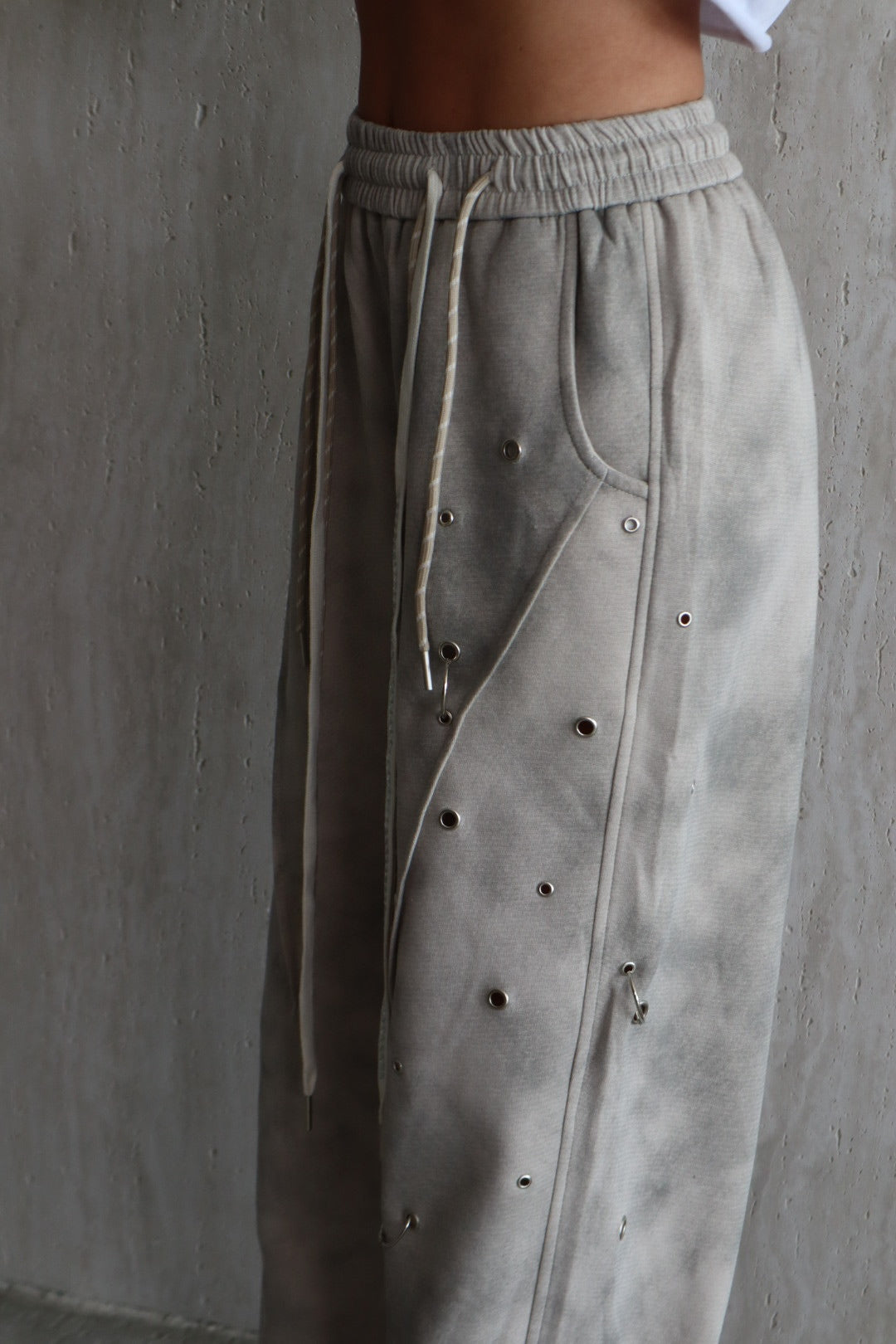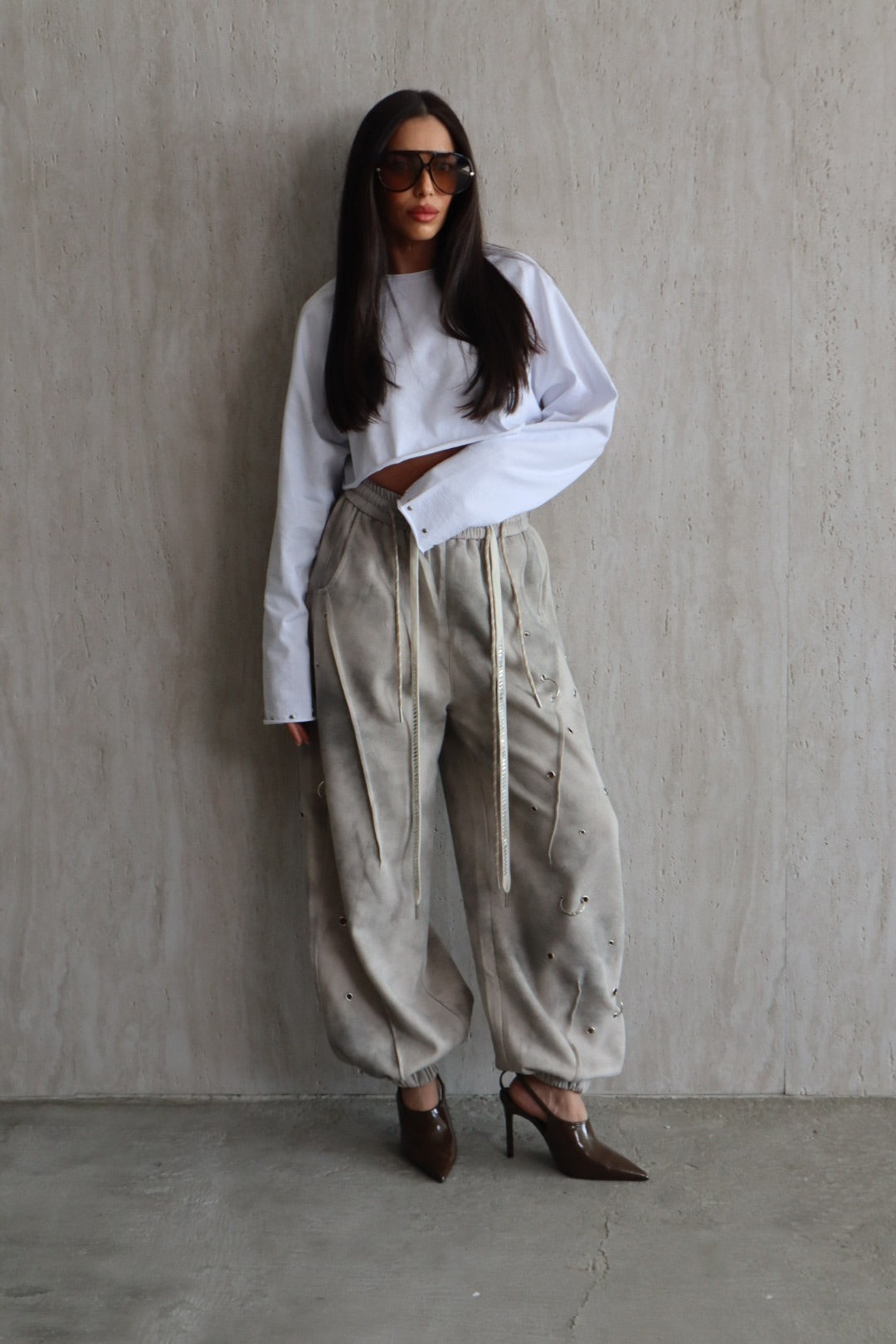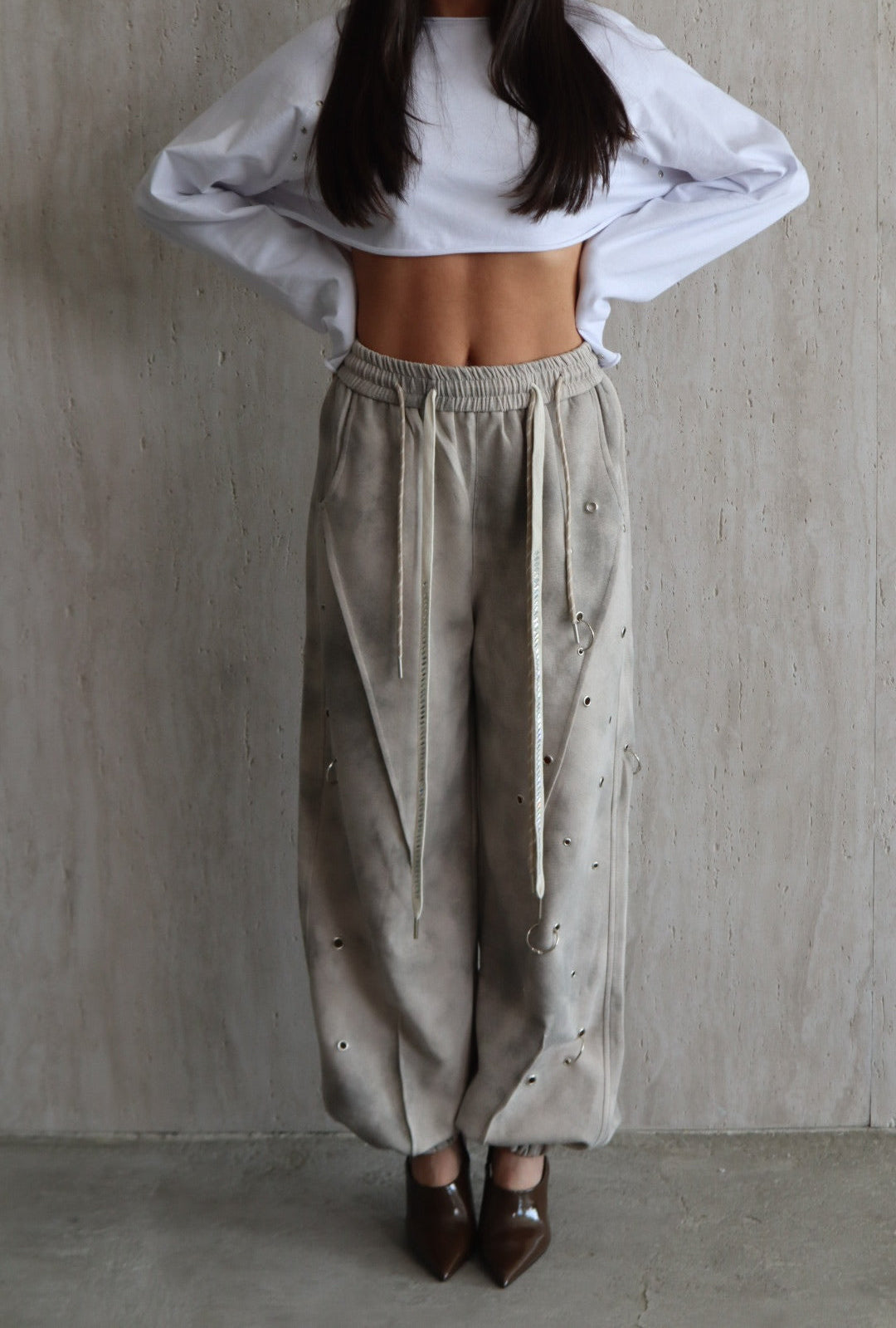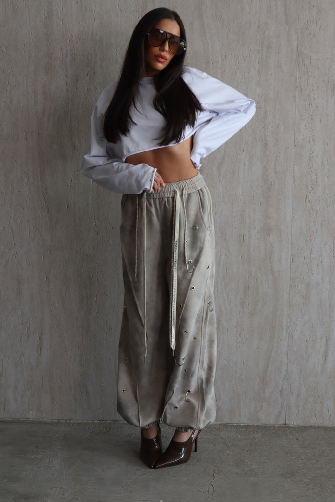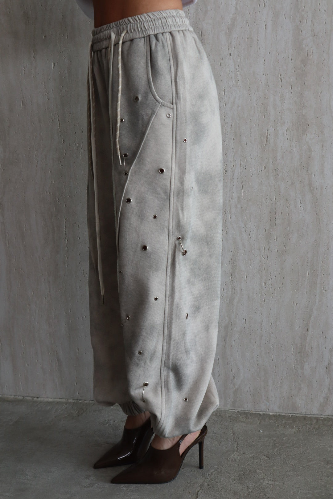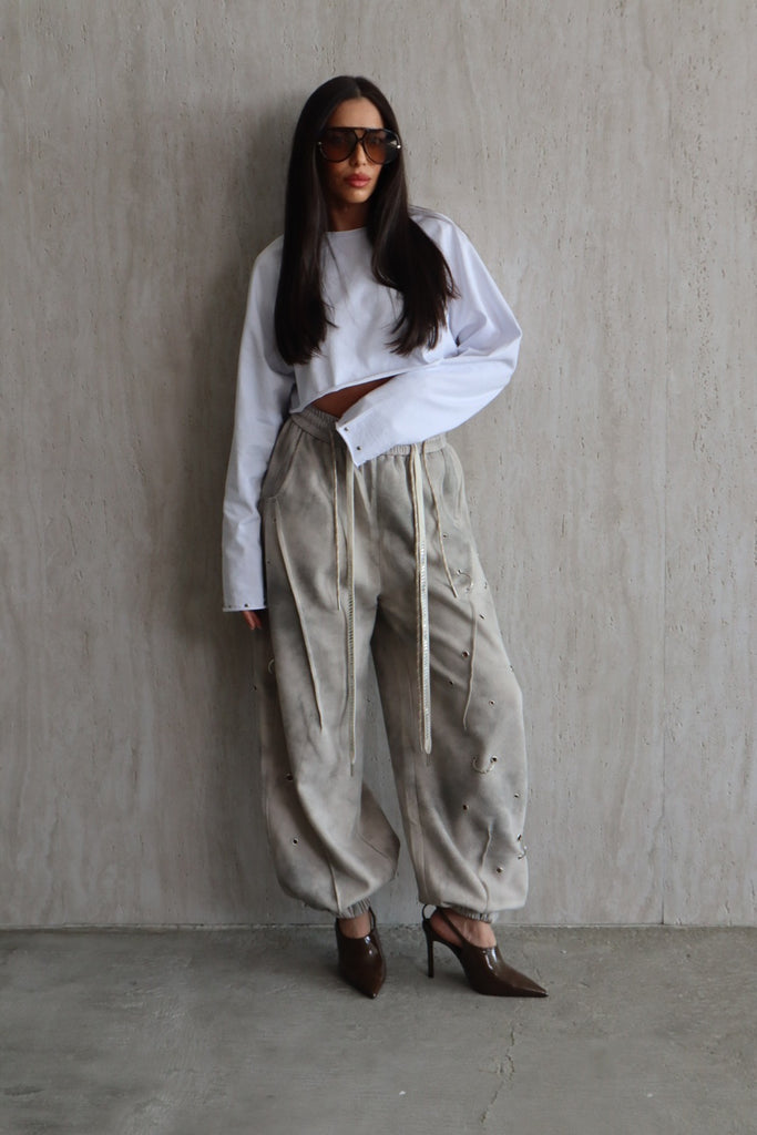 מכנס אפור מעושן בגזרת בלון אובר סייז עם איבקות מתכתיים וגומי בסיומת של ב הרגל