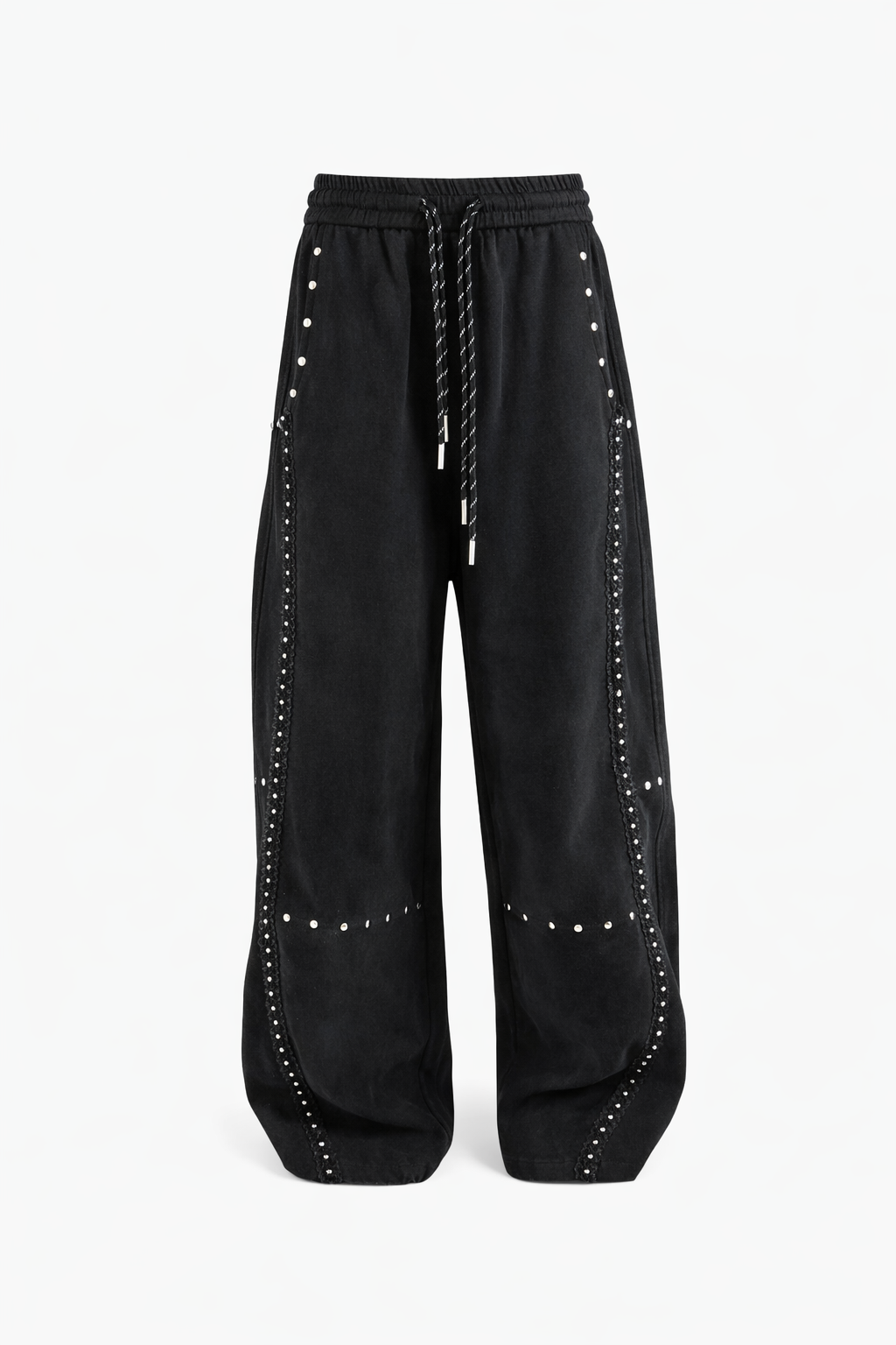מכנס מעוטר בסרט תחרה וניטים לאורך כל הרגל, ושני שרוכים משולבים.