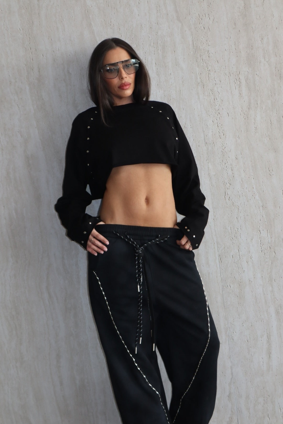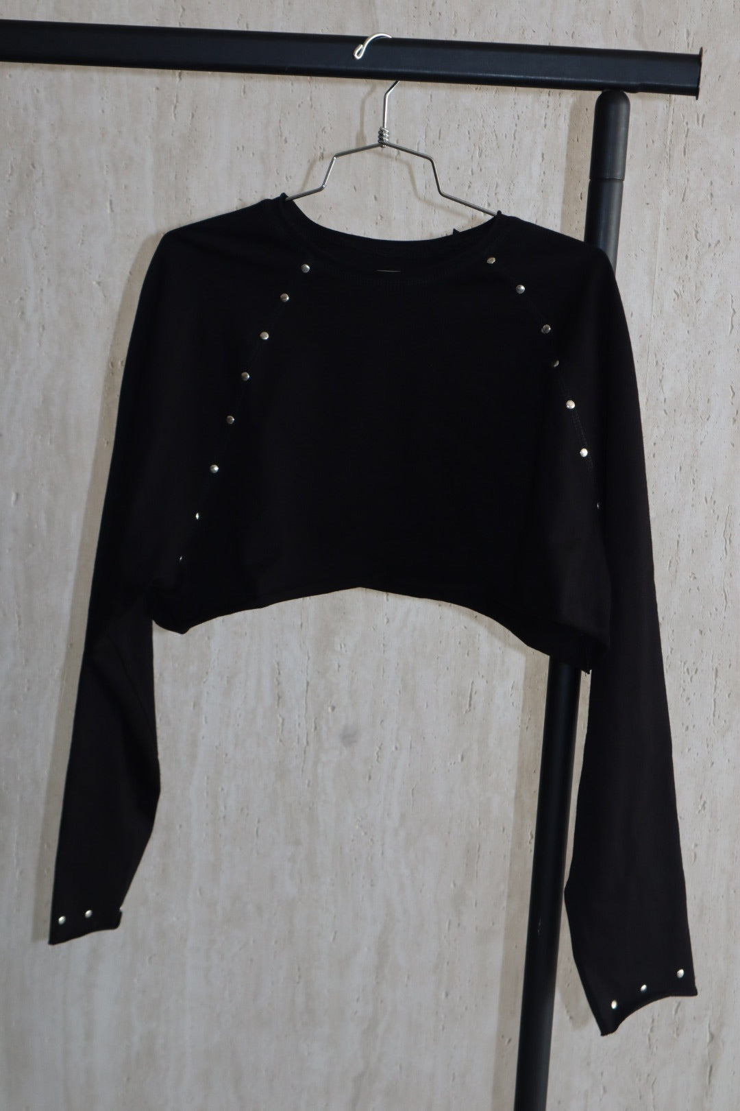 חולצת קרופ שחורה בגזרה רחבה גזורה עם ניטים מתכתיים לכל אורך הכתפיים והשרוולים