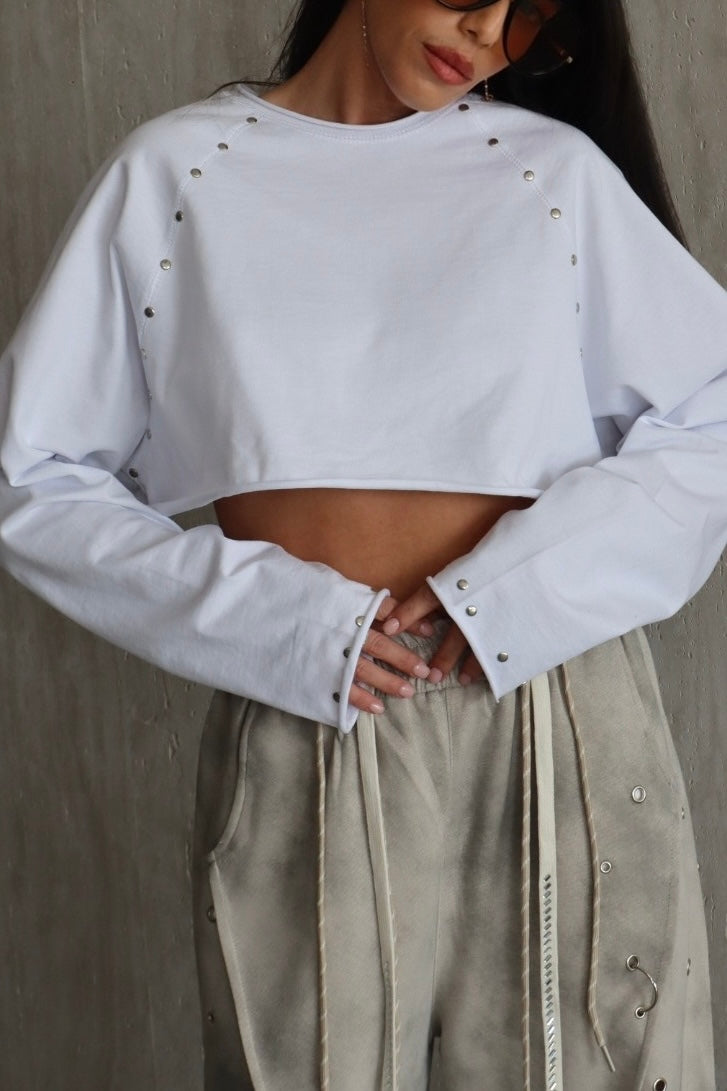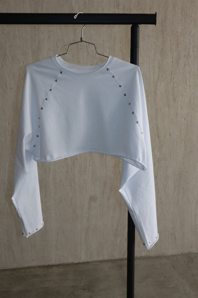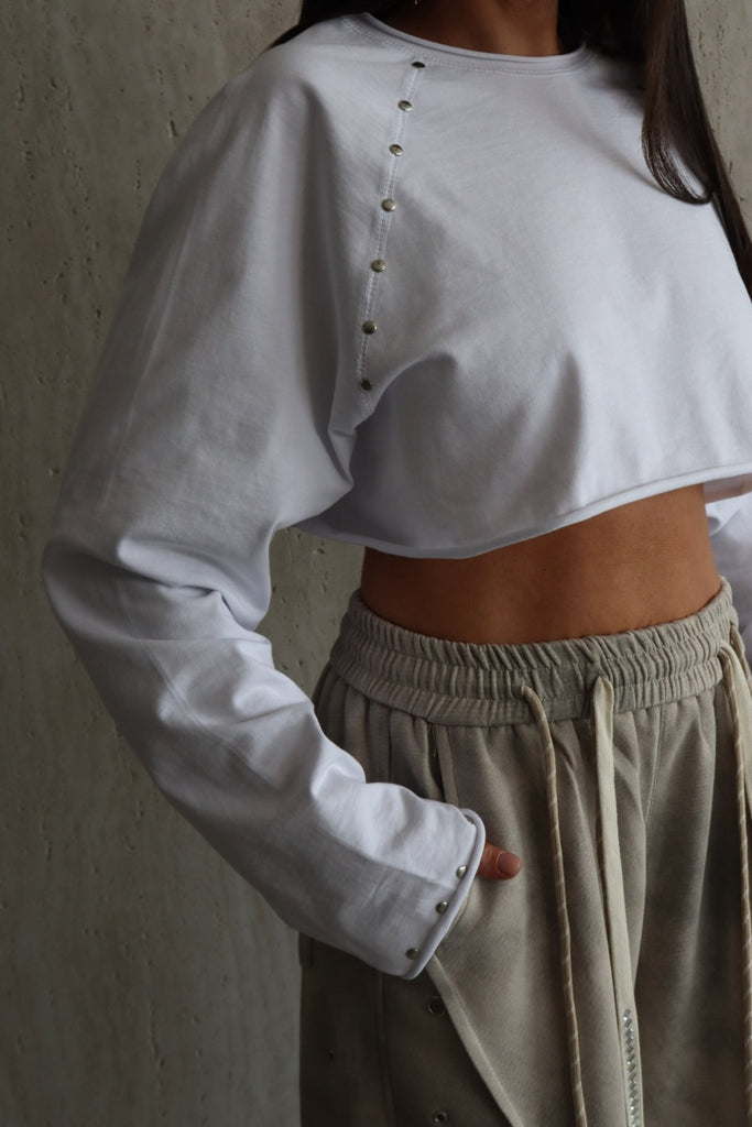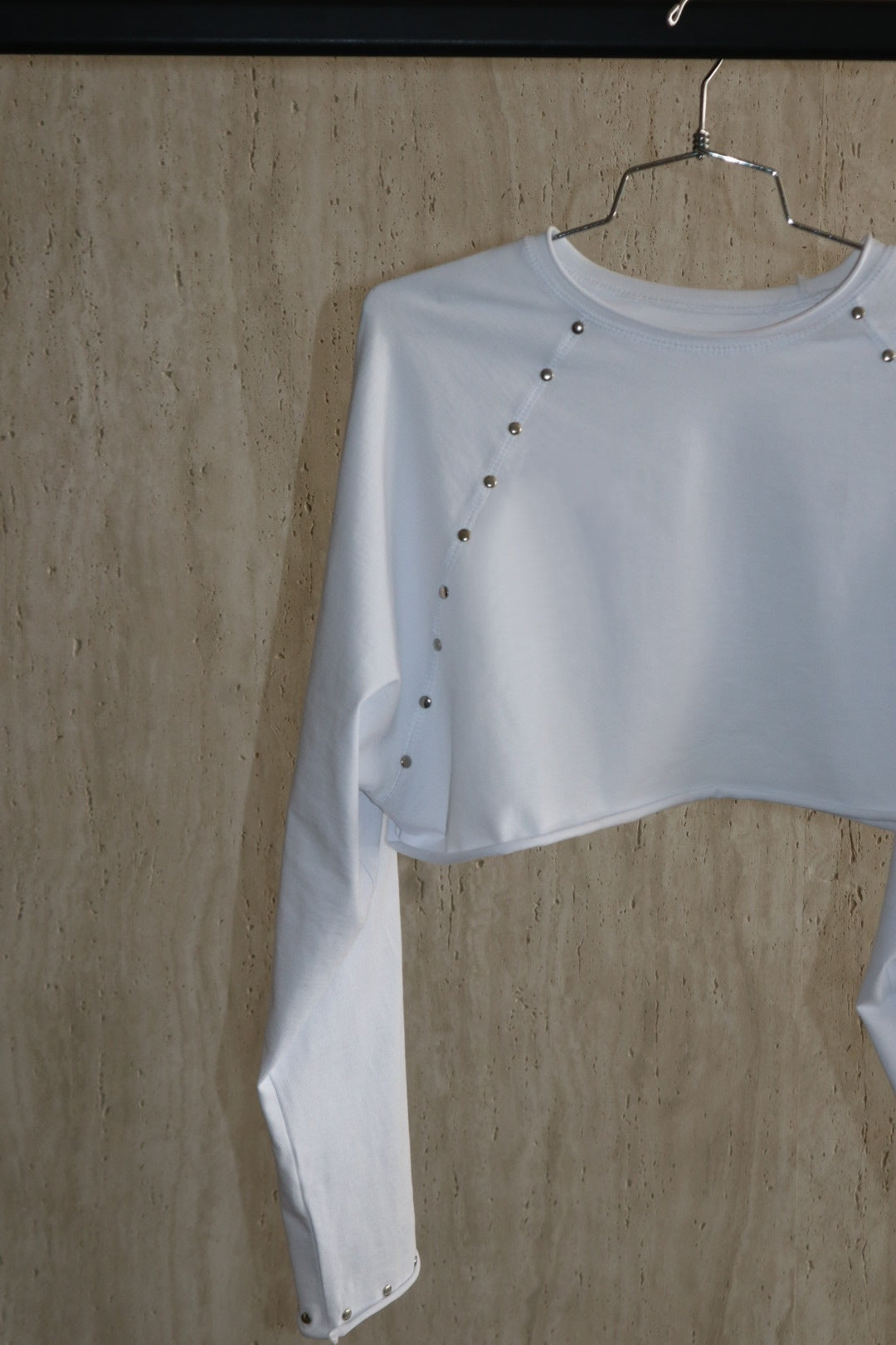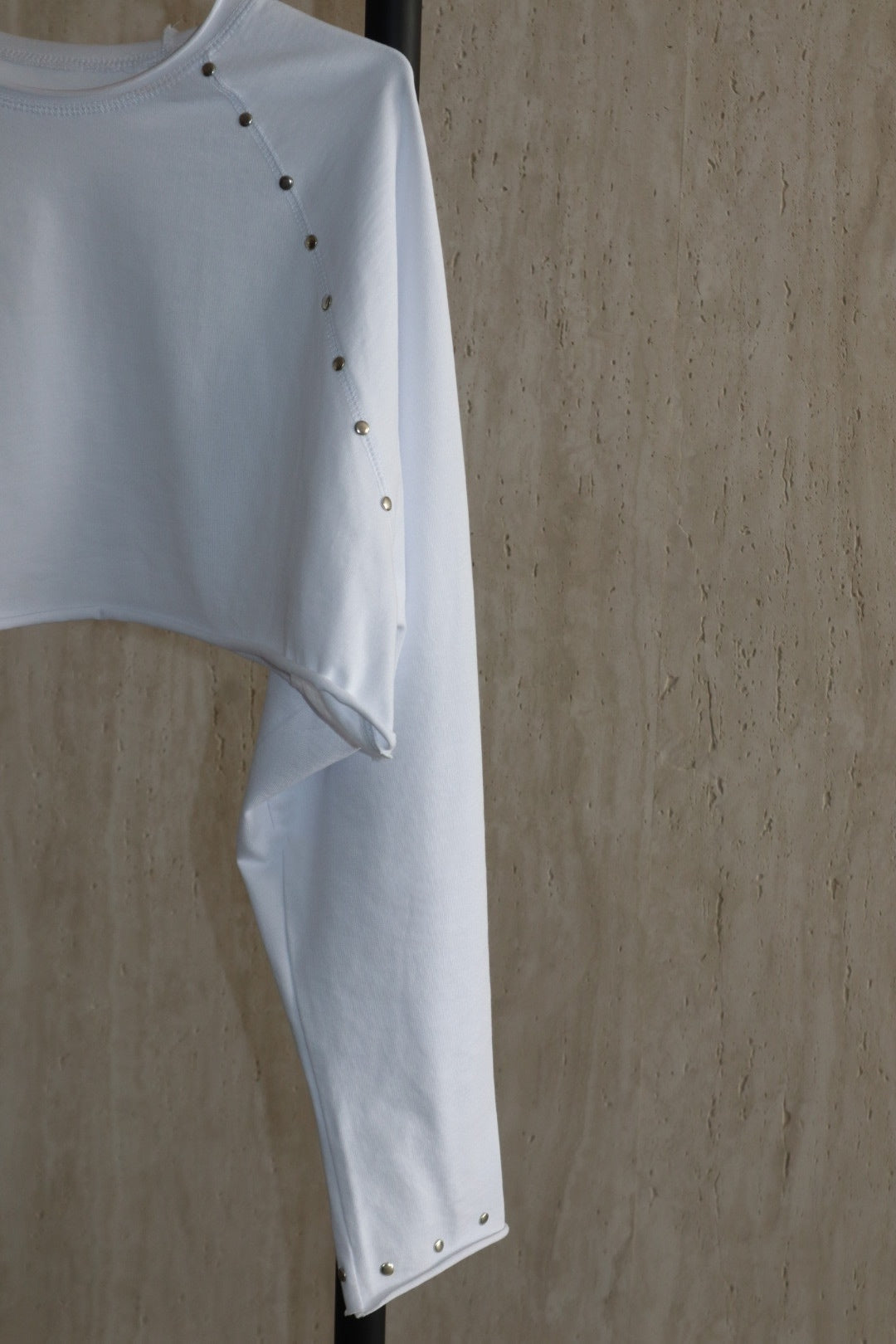 חולצת קרופ לבנה בגזרה רחבה גזורה עם ניטים מתכתיים לכל אורך הכתפיים והשרוולים