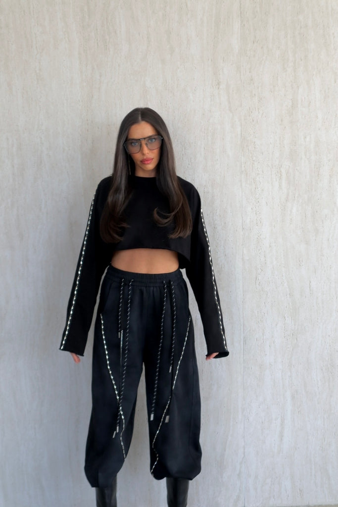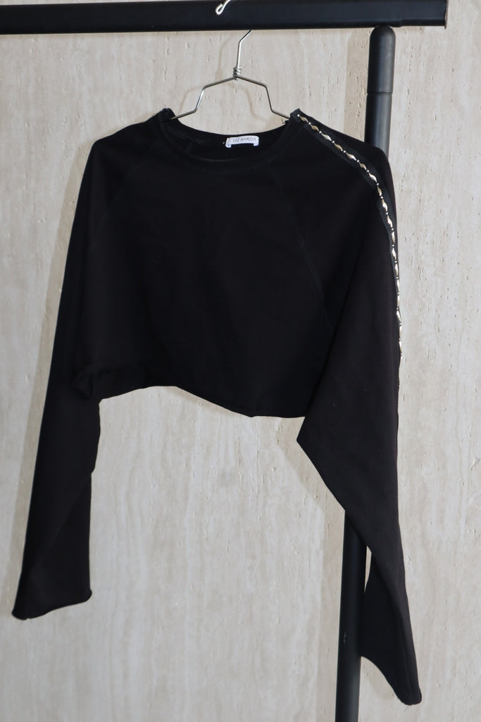 חולצת קרופ טופ שחורה בגזרה רחבה , גזרת CUT עם שרוולים ארוכים ודיטייל כסוף לאורך כל השרוול