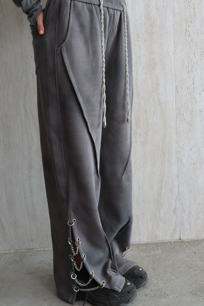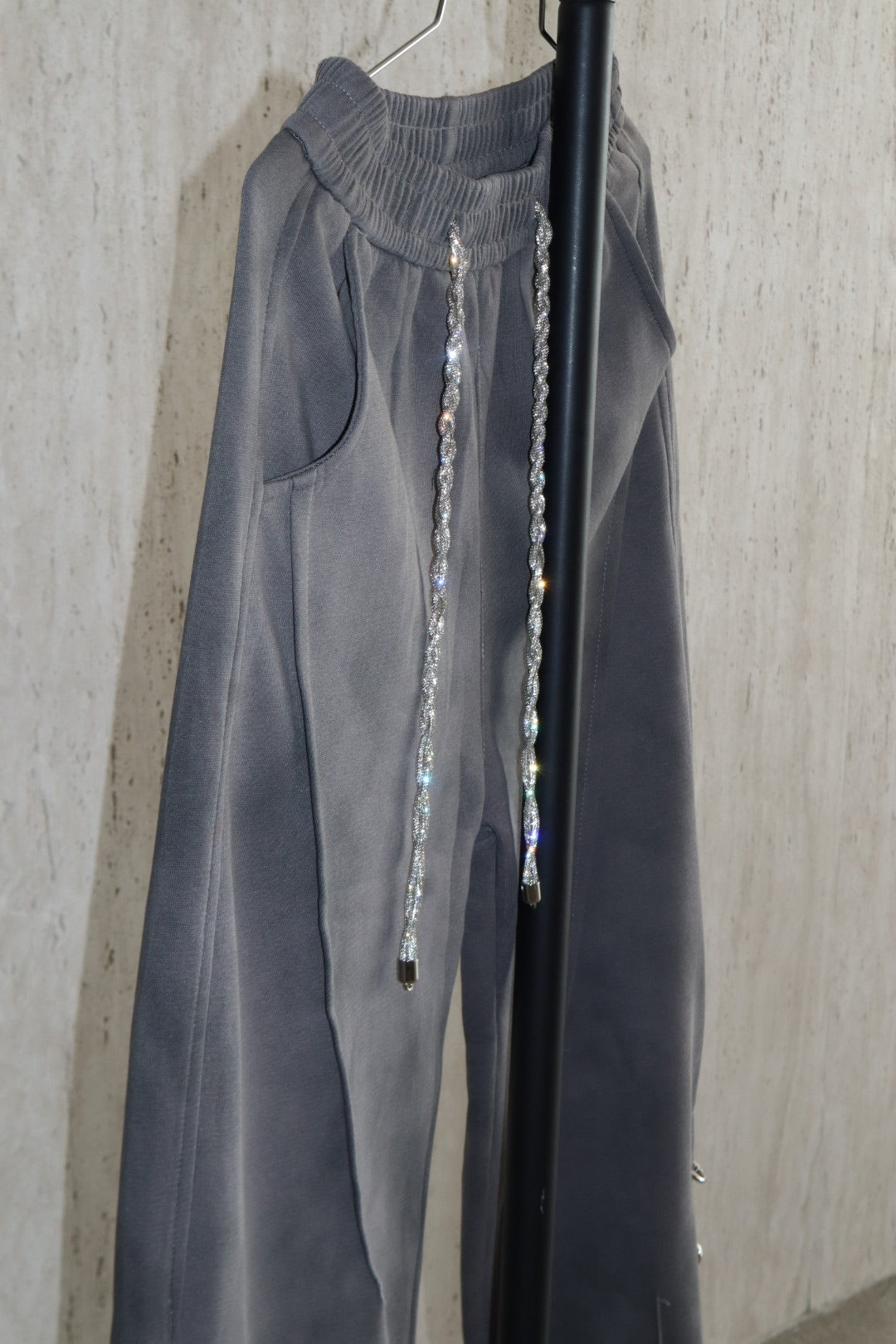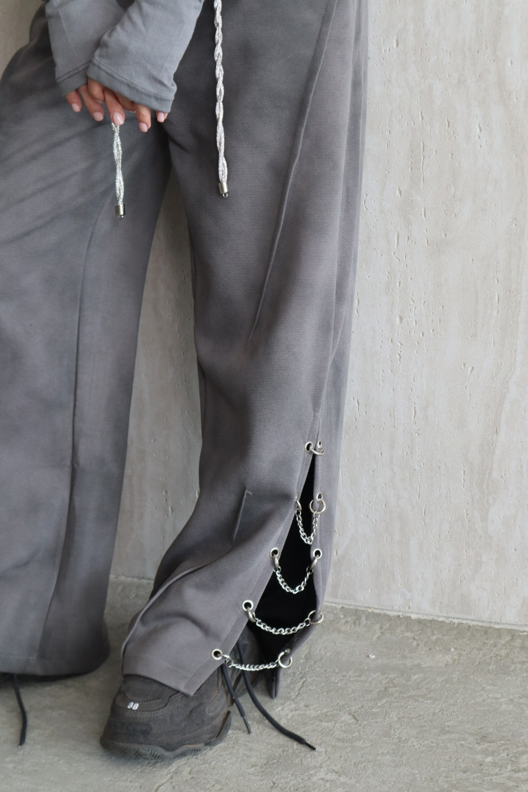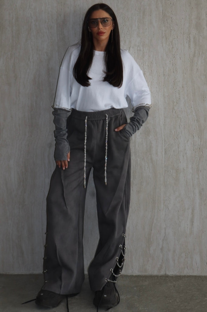 מכנס אובר סייז אפור סטון וואש עם שרוכי קליעה יהלומים דטייל אבקות ושרשראות בחלק התחתון